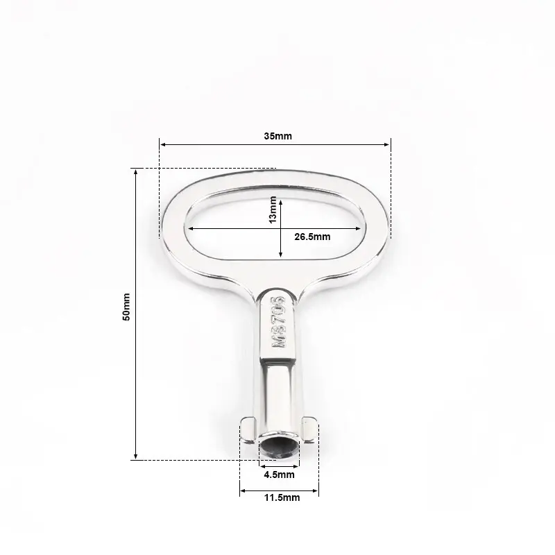 Никел-обложен алуминиум двојно-битен клуч: Целокупни димензии 35 × 50мм, дијаметар на Центарот за заклучување на цилиндарот 4,5мм, Центар за заклучување на цилиндарот + Двоен дијаметар на забите 11,5мм.