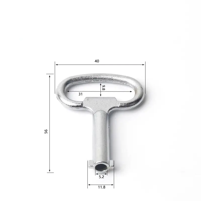 Сатен финиш алуминиум двојно-битен клуч: Целокупни димензии 40 × 56мм, дијаметар на Центарот за заклучување на цилиндарот 5,2мм, Центар за заклучување на цилиндарот + Двоен дијаметар на забите 11,8мм.