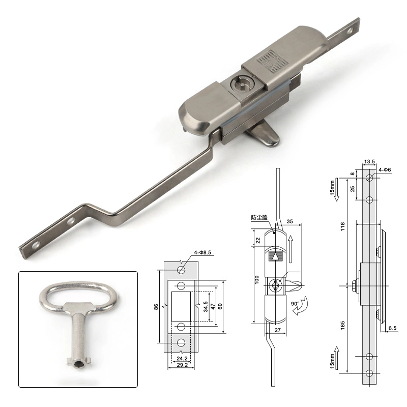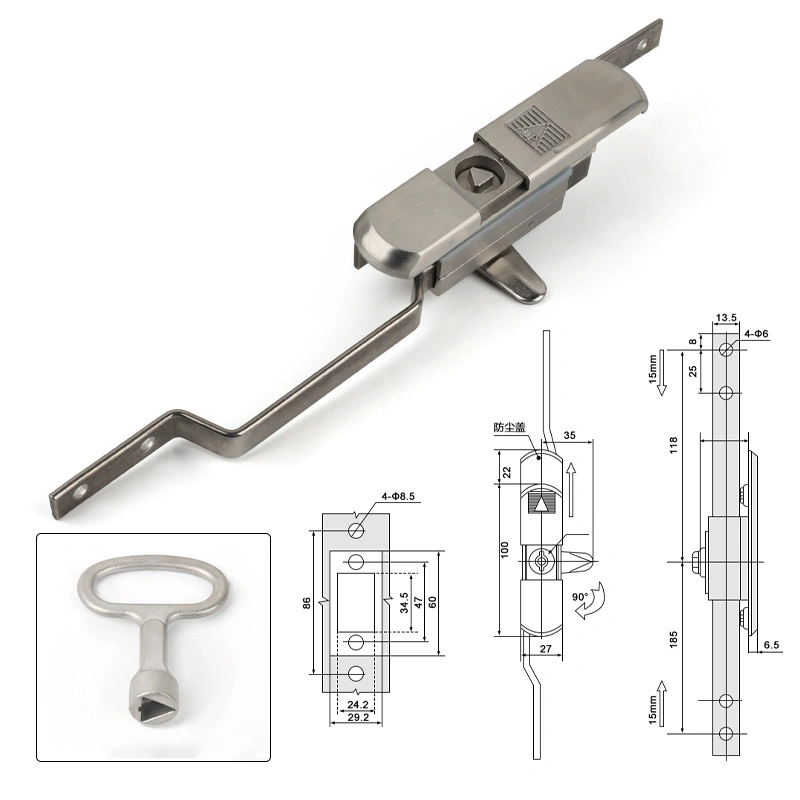 Функцијата на ова заклучување е да ги обезбеди вратите на кабинетот преку механизам за вертикална шипка, обезбедување сеопфатна заштита за електрични ормани или лавици на сервери. Дизајнот на производот е компатибилен со кабинетите Rittal и стандардните тела на кабинетот, а инсталацијата не влијае на структурата на вратата. Телото на заклучувањето има покривка за прашина за поедноставено одржување.